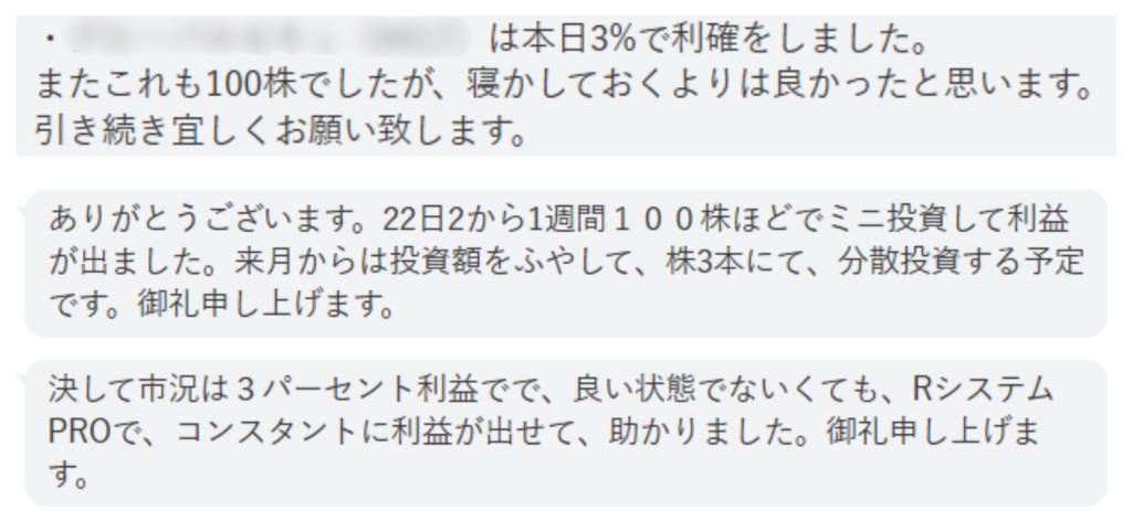 メッセージの多くに「100株での取引」といった言葉が見られます。